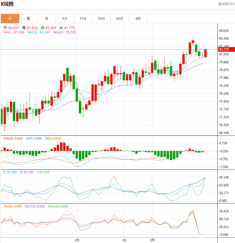 原油上周周线收于80.7,周线探高后无力连阳强势上涨,日线图三连阴回撤后,回撤力度有所减缓,本周留意能否重新启稳回升,启稳则看再度上扬收复失地,并且有蓄势突破之势。4小时图迂回反复拉锯,目前暂时保持在上升台阶通道中运行,只是拉锯的幅度略大,空间上已基本回撤到位,留意这个星期刚开始的时候能不能在80.0附近启稳,启稳后继续转换上升。