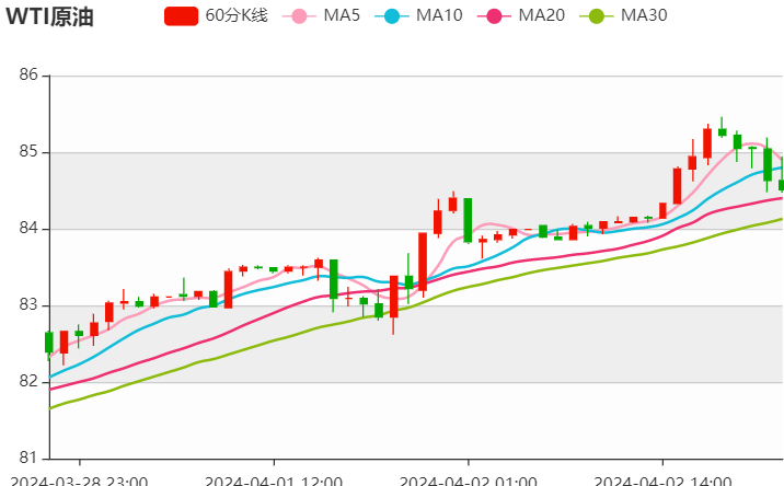 周二(4月2日),WTI原油期货震荡走高,盘中报84.89美元每桶,涨幅1.09%。