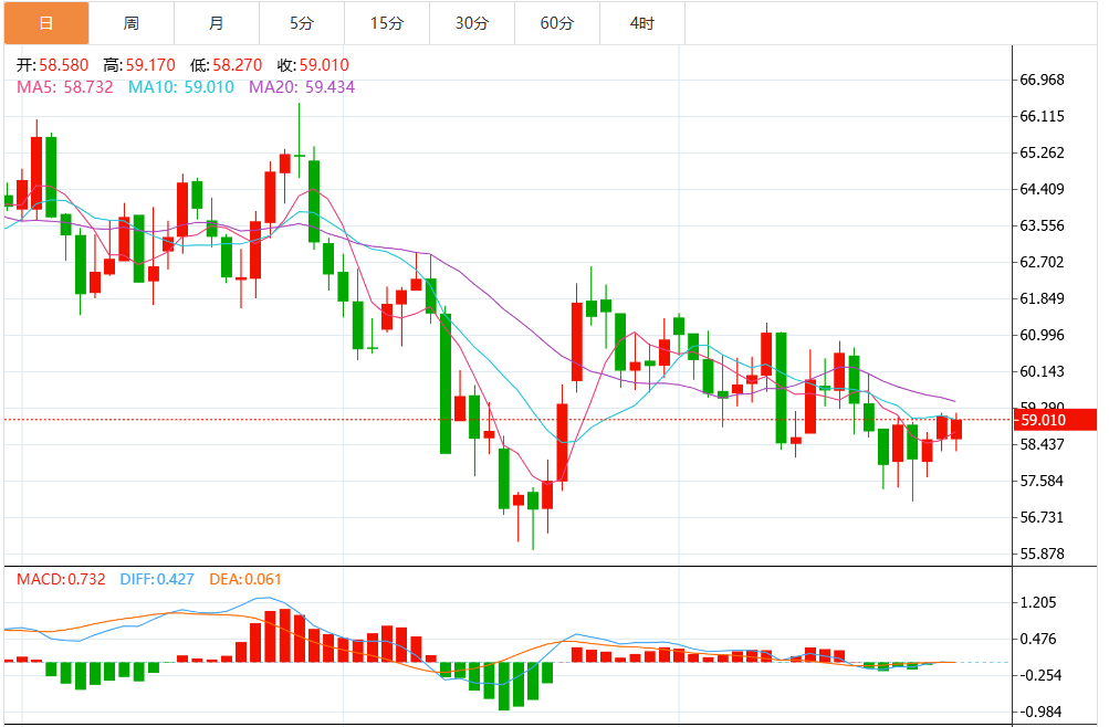 原油从日线图级别看,从局部级别看,当下震荡节奏呈次要震荡,K线连收3根阴线,向前期低点56附近进行测试。MACD指标在零轴下方附近形成死叉,空头动能有逐渐增加迹象。56强支撑位被跌破,则原油走势中期将进入下行节奏。原油短线(1H)走势突破区间上沿,具体是否形成有效突破需进一步验证。均线系统多头排列,依托油价,短线客观趋方向转为向上。MACD指标在零轴上方张口平缓向上,多头动能占一定的优势。