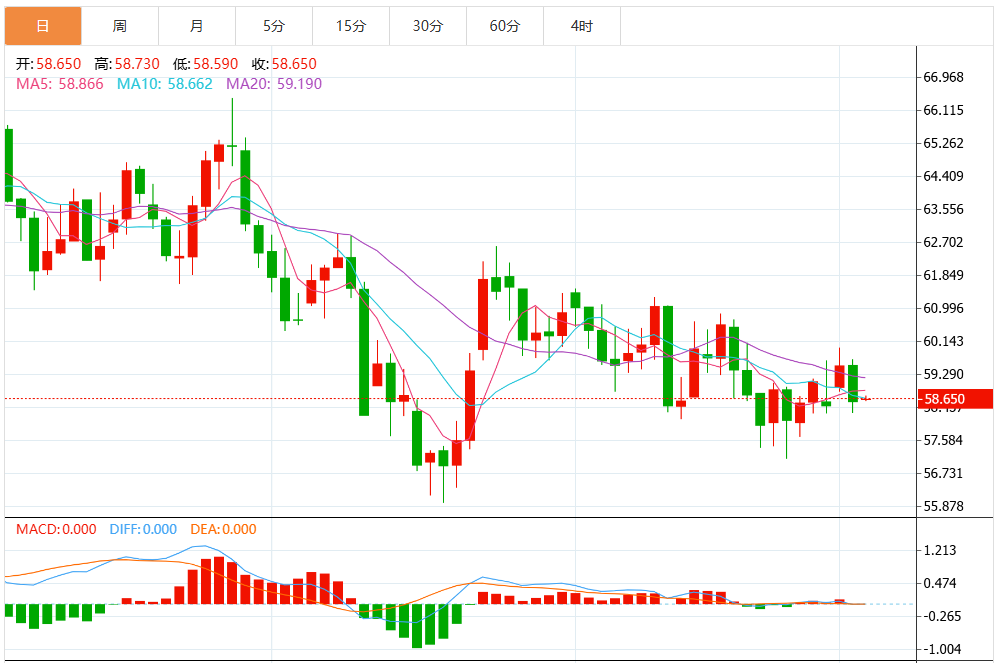 MACD 指标重新回落至零轴下方,并出现绿柱扩大的迹象,说明动能正在向空方倾斜。当前市场对于反弹的接受度较低,任何回升至 58.5 至 59.2 美元附近的动作,都可能遭遇卖压。从下方支撑角度观察,56.8 至 55.8 美元的区间构成下一道关键防守带。如果油价随后无法在此区域企稳,那么更深的调整空间将被打开。
