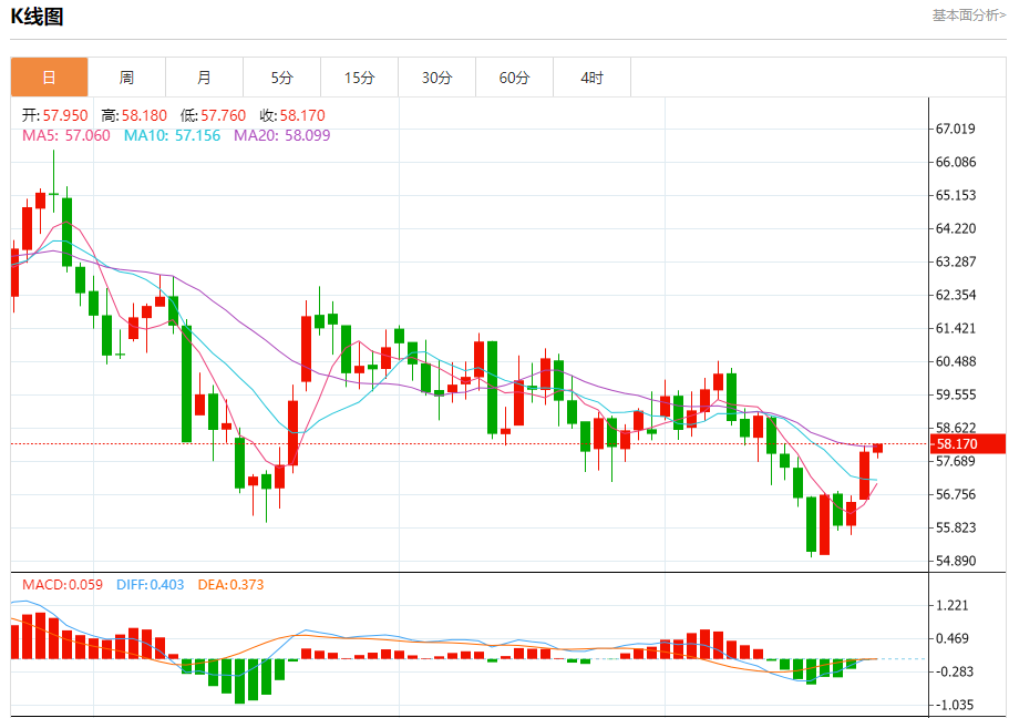 周二盘中,WTI原油报58.160,涨幅0.28%。