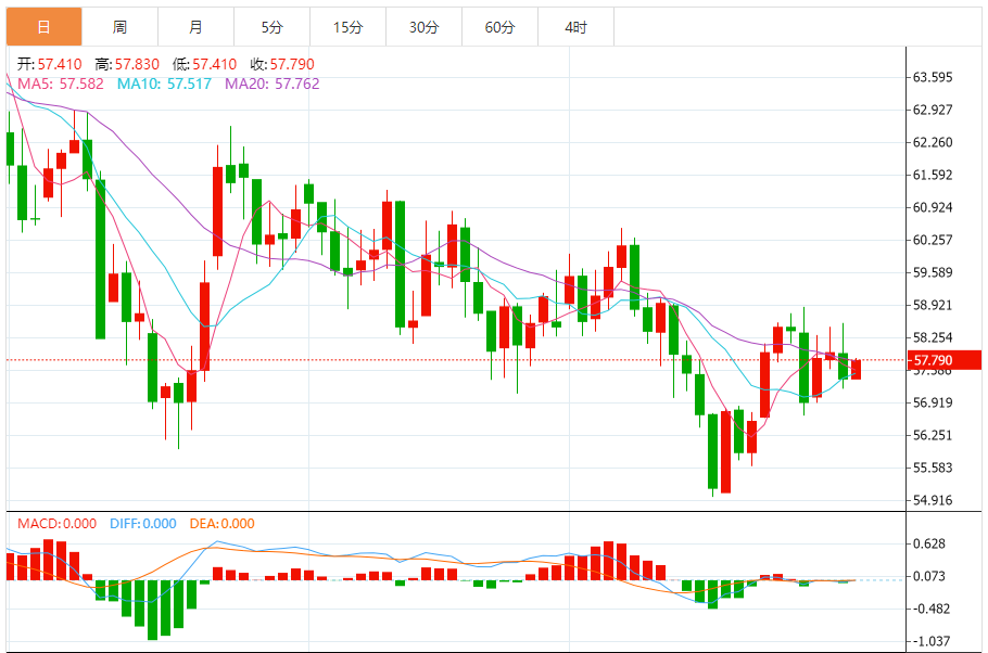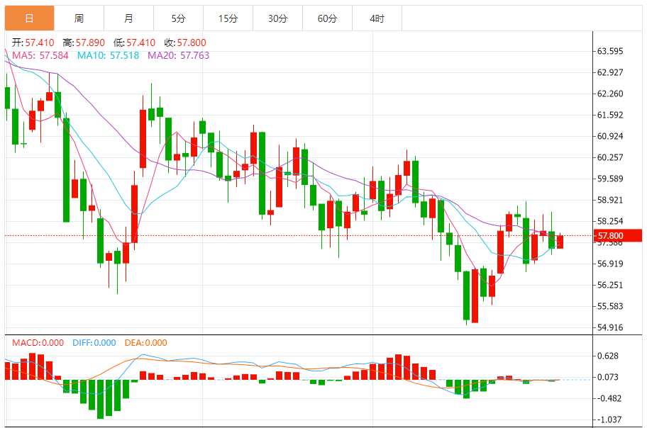 阻力位:第一阻力57.80美元/桶(日内高点及布林带上沿);第二阻力59.00美元/桶(整数关口+下降通道上沿);强阻力62.00美元/桶(20周均线压制位)。