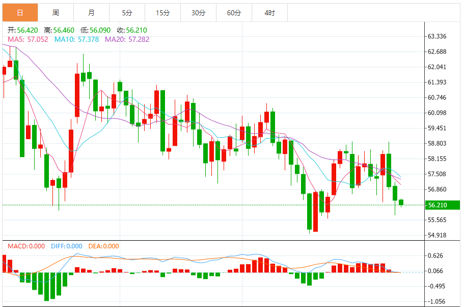 20日指数移动平均线(EMA)在57.47美元下行并限制反弹,保持偏向看跌。价格守在下跌平均线以下,反弹将保持修正性,跌破55美元支撑后,可能更深回撤至心理位50.00美元。