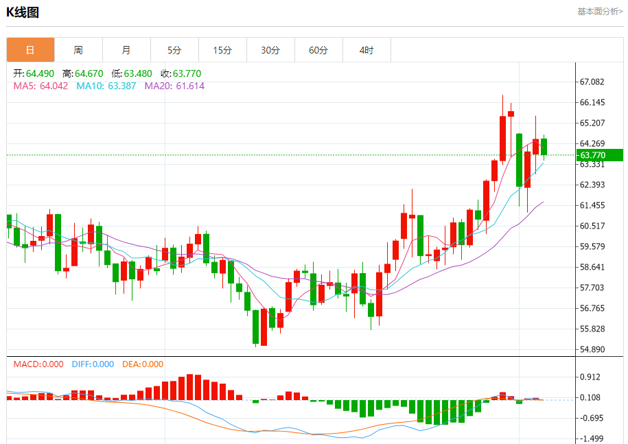 周四盘中,WTI原油报63.780,跌幅2.07%。