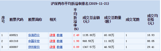 折溢价方面,溢价率最高的个股是华海药业,溢价率为2.49%,成交价为18.93元,成交1笔金额为1135.80万元,数量为60.00万股;折价率最高的个股是跨境通,平均折价率为16.55%,成交均价为6.23元,成交2笔总金额为6933.90万元,总数量为1113.82万股。