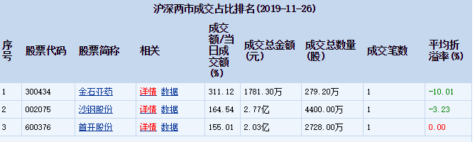 2019年11月26日沪深两市42只个股发生65笔大宗交易,共成交12.47亿元;其中,沪市11只个股共17笔大宗交易,总成交金额为3.28亿元;深市31只个股共48笔大宗交易,总成交金额为9.19亿元。沪指当日收盘报2907.06点,上涨0.03%,上涨1.00点,成交金额1654.97亿元。