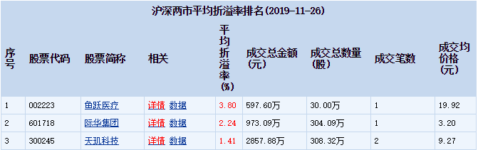 折溢价方面,溢价率最高的个股是鱼跃医疗,溢价率为3.80%,成交价为19.92元,成交1笔金额为597.60万元,数量为30.00万股;折价率最高的个股是电连技术,折价率为14.66%,成交价为33.36元,成交1笔金额为483.72万元,数量为14.50万股。