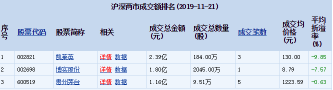 2019年11月21日沪深两市54只个股发生90笔大宗交易,共成交15.11亿元其中,沪市20只个股共31笔大宗交易,总成交金额为2.90亿元;深市34只个股共59笔大宗交易,总成交金额为12.21亿元。沪指当日收盘报2903.64点,下跌0.25%,下跌7.00点,成交金额1398.51亿元。 折溢价方面,溢价率最高的个股是华海药业,溢价率为2.49%