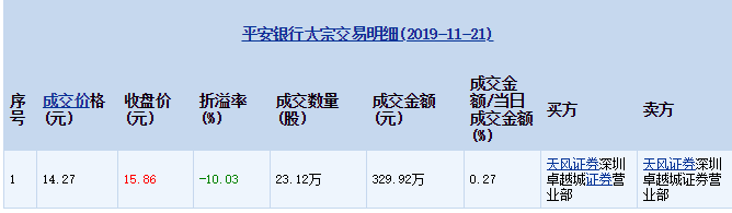 2019年11月21日,平安银行发生了1笔大宗交易,总成交数量为23.12万股,总成交金额为329.92万元,成交价格为14.27元,当日收盘报价15.86元,涨幅0.06%,成交金额12.19亿元;大宗交易成交金额占当日成交金额0.27%,折价10.03%。 大宗交易详情如下表所示: 11月21日,凯莱英、博实股份、贵州茅台、美的集团、巨人