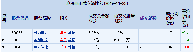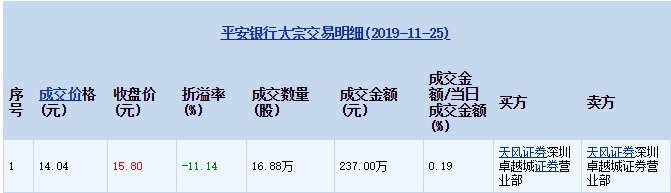 2019年11月25日,平安银行发生了1笔大宗交易,总成交数量为16.88万股,总成交金额为237.00万元,成交价格为14.04元,当日收盘报价15.80元,涨幅1.35%,成交金额12.33亿元;大宗交易成交金额占当日成交金额0.19%,折价11.14%。 大宗交易详情如下表所示: 11月25日,桂冠电力、华策影视、卓郎智能、巨人网络、美