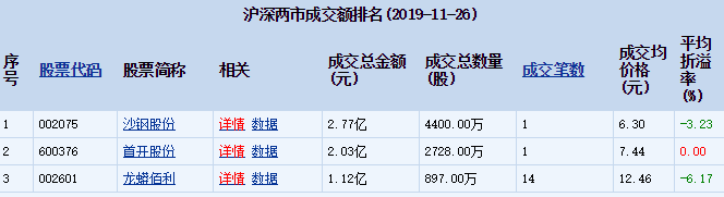 2019年11月25日沪深两市48只个股发生81笔大宗交易,共成交20.93亿元其中,沪市13只个股共20笔大宗交易,总成交金额为10.42亿元;深市35只个股共61笔大宗交易,总成交金额为10.51亿元。沪指当日收盘报2906.17点,上涨0.72%,上涨21.00点,成交金额1742.35亿元。 折溢价方面,溢价率最高的个股是中国人保,溢价率为9.08
