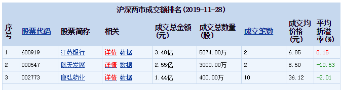 2019年11月28日沪深两市52只个股发生95笔大宗交易,共成交19.37亿元其中,沪市19只个股共30笔大宗交易,总成交金额为5.80亿元;深市33只个股共65笔大宗交易,总成交金额为13.57亿元。沪指当日收盘报2889.69点,下跌0.47%,下跌14.00点,成交金额1226.17亿元。 折溢价方面,溢价率最高的个股是贵州茅台,溢价率为10.56