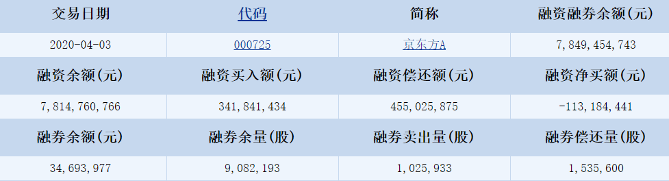 京东方A(000725)2020-04-03融资融券信息显示,京东方A融资余额7,814,760,766元,融券余额34,693,977元,融资买入额341,841,434元,融资偿还额455,025,875元,融资净买额-113,184,441元,融券余量9,082,193股,融券卖出量1,025,933股,融券偿还量1,535,600股,融资融券余额7,849,454,743元。京东方A融资融券详细信息如下