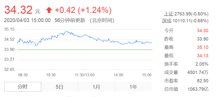 4月3日山东黄金股票收盘价34.32涨幅1.24%。