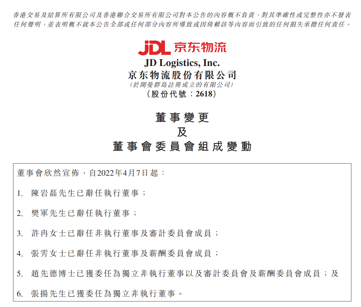 京东物流发布董事会成员变更公告。