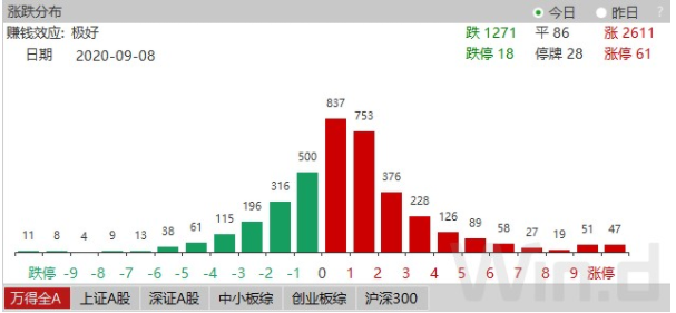 Wind数据显示,A股今日有2611只股票处于上涨,其中涨停家数为61家,而反观下跌家数,今日却有1271家,跌停家数为18家,数据较上个交易日有所回暖,其中,个股涨跌幅的主要分布来看,有1590只个股集中在涨幅0%至2%左右,占据了全市场的40.07%,从而说明了大部分的个股今日为弱反弹。