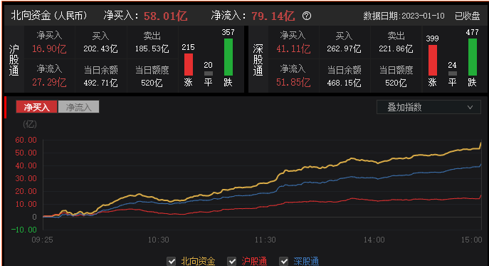 北向资金连续5日加仓累计超340亿元。今日全天净流入超79亿元,其中沪股通流入超27亿元,深股通流入超51亿元。