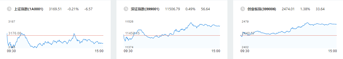 A股三大指数全天分化,沪指止步6连阳,创业板指大涨逾1%。个股跌多涨少;两市成交额7472亿元,较上个交易日缩量600亿元。截至收盘,上证指数跌0.21%,报3169.51点;深证成指涨0.49%,报11506.79点;创业板指涨1.38%,报2474.01点。