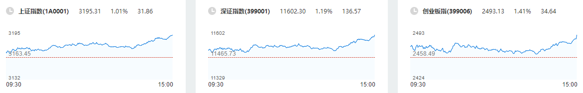 三大指数全天高开高走,三大指数均涨超1%逼近3200点,上证50指数涨超1.5%。盘面上,金融股集体走强,湘财股份涨停,中信建投涨超6%,新华保险涨近5%。家电家居股震荡走高,倍轻松、石头科技涨超10%,科沃斯、曲美家居等涨停。医疗器械股展开反弹,眼科医疗方向领涨,何氏眼科涨超10%,华厦眼科、欧普康视涨超7%。