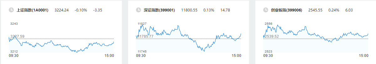 A股三大股指小幅高开,此后走势分化。沪指、深证成指陆续翻绿,临近尾盘,深证成指再度飘红。截至收盘,沪指跌0.10%,报3224.24点;深证成指涨0.13%,报11800.55点;创业板指涨0.24%,报2545.55点。沪深两市所有交易个股涨跌比为1963:2875,两市涨停38家,跌停10家。