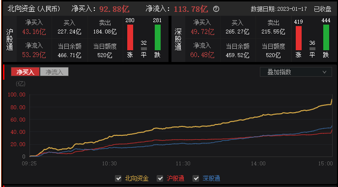 北向资金全天净流入超113亿元,其中沪股通流入超53亿元,深股通流入超60亿元。