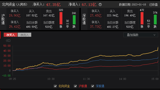 1月18日,北向资金全天净流入47.35亿元,宁德时代净买入10.24亿元居首,中国平安、贵州茅台、五粮液等净流入居前。药明康德净卖出3.32亿元居首,长江电力、恩捷股份、紫光国微等净流出居前。