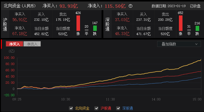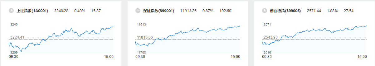 1月19日,两市股指午后发力拉升,创业板指涨超1%,科创50指数涨超1.5%;两市成交额略有放大,全日成交近7000亿元,北向资金净买入超90亿元。截至收盘,沪指涨0.49%报3240.28点,深成指涨0.87%报11913.26点,创业板指涨1.08%报2571.44点,科创50指数涨1.68%;两市全日成交6870亿元,北向资金净买入93.93亿元。