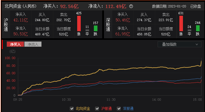 北向资金今日继续进场扫货,全天净买入92.56亿元,为连续13日净买入,其中沪股通净买入42.11亿元,深股通净买入50.46亿元。