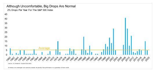 正如LPL图表所示,平均每年至少有超过5个独立的交易日,标普500指数会出现大于2%的回调。即便是去年股市上涨30%的时候,标普500指数也有五个交易日分别下跌至少2%。