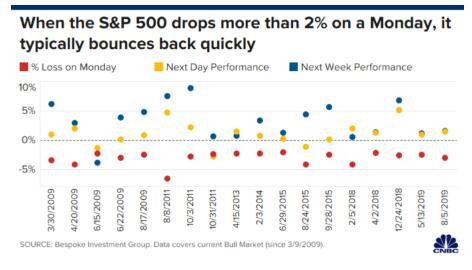 根据Bespoke Investment Group数据,在2009年3月以来,标普500指数过去有18次于周一下跌逾2%,之后第二天的平均涨幅为1.02%。此外,在接下来的一周内,有17次标普上涨,平均涨幅3.16%,1个月后的平均涨幅为6.08%。