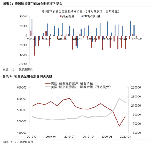 因此,美股反弹的逻辑应该是这样的:3月23日,美联储创设PMCCF和SMCCF,尽管这两个工具直到5月才开始实施,但由于这两个工具可以比较有效地解决信用市场的问题,从而有效提升了市场信心。于是,居民部门和杠杆资金便开始加仓购买美股,导致了这一波美股的反弹。因此,本轮美股反弹,主要应该是信心增强导致的估值提升,而并非单纯的流动性宽松导致的估值提升。