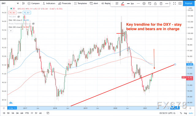如下图所示,目前美元已经上升到关键的93点附近,并受到图表上标记的关键多年趋势线的限制。这个水平仍然很关键,只要价格保持在趋势线以下,那么荷兰国际集团的前景或许是正确的,美元指数有望打开回到89.00的通道。