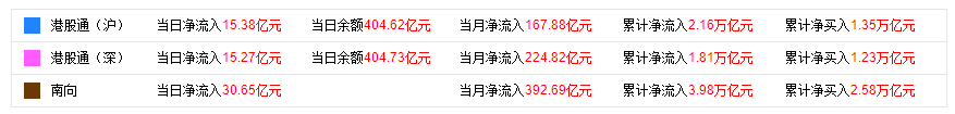 今日,南向资金全日合计净流入30.65亿港元,其中,沪市港股通净流入15.38亿港元,深市港股通净流入15.27亿港元。