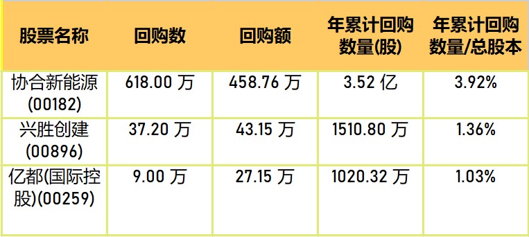 亿都(国际控股)(00259)、兴胜创建(00896)、协合新能源(00182)于2023年3月1日进行了回购。其中,回购金额最大的为协合新能源(00182),回购数量618.00 万,回购金额458.76 万元。