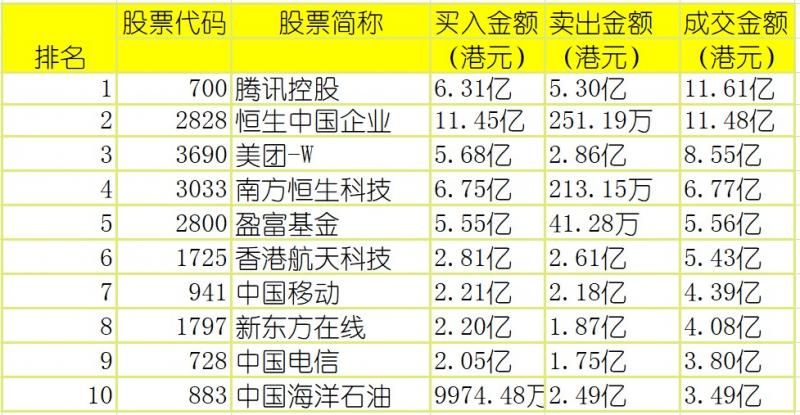 亚汇网3月2日港股通数据统计显示:腾讯控股成交额居首,达11.61亿港元,恒生中国企业卖出额居第一位