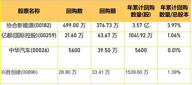 亿都(国际控股)(00259)、兴胜创建(00896)、中华汽车(00026)、协合新能源(00182)于2023年3月2日进行了回购。其中,回购金额最大的为协合新能源(00182),回购数量499.00 万,回购金额376.73 万元。