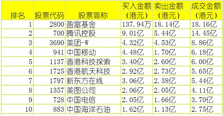 亚汇网实时数据统计:截至3月9日收盘,腾讯控股、盈富基金、中国移动(沪)成交前三,盈富基金、腾讯控股、美团-W(深)成交前三。