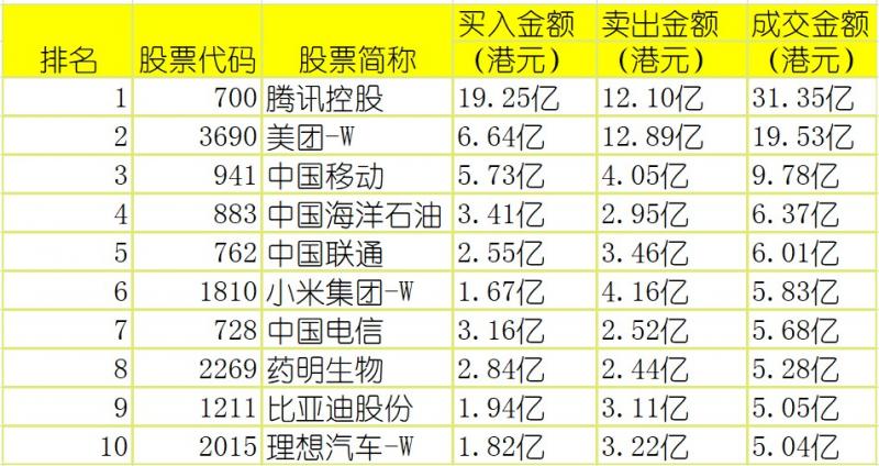 亚汇网实时数据统计:截至3月10日收盘,腾讯控股、美团-W、中国移动(沪)成交前三,腾讯控股、美团-W、中国移动(深)成交前三。