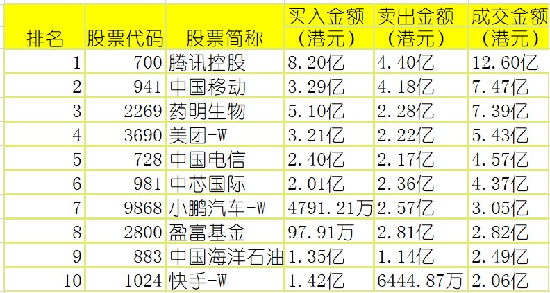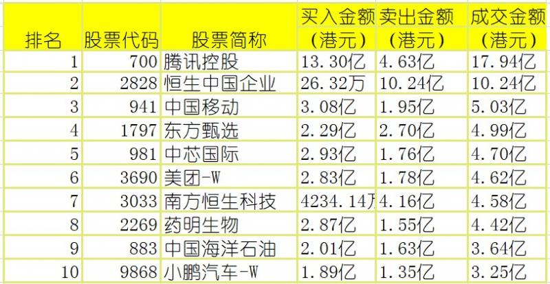 港股通(沪)买卖前十股(单位:港元):