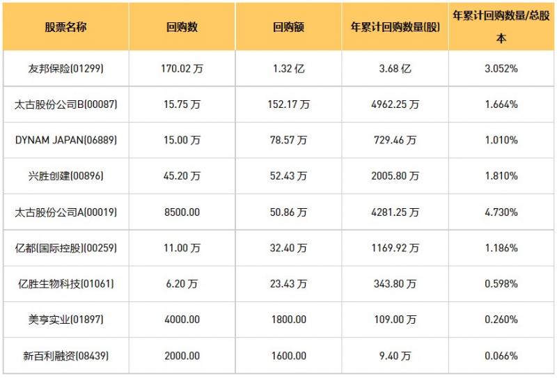 亿胜生物科技(01061)、新百利融资(08439)、亿都(国际控股)(00259)、DYNAM JAPAN(06889)、兴胜创建(00896)、美亨实业(01897)、太古股份公司A(00019)、友邦保险(01299)、太古股份公司B(00087)于2023年3月21日进行了回购。其中,回购金额最大的为友邦保险(01299),回购数量170.02 万,回购金额1.32 亿元。