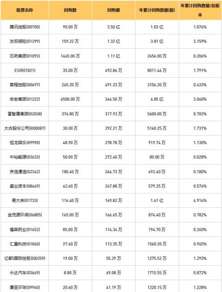 富智康集团(02038)、天福(06868)、宏安集团(01222)、亿都(国际控股)(00259)、首程控股(00697)、百宏实业(02299)、腾讯控股(00700)、太古股份公司A(00019)、石药集团(01093)、京信通信(02342)、太古股份公司B(00087)、祖龙娱乐(09990)、友邦保险(01299)、易大宗(01733)、中裕能源(03633)、乐声电子(00213)、清科创业(01945)、康圣环球(09960)、盛业资本(08469)、汇量科技(01860)、永达汽车(03669)、福森药业(01652)、ESR(01821)、金茂源环保(06805)于2023年3月31日进行了回购。其中,回购金额最大的为腾讯控股(00700),回购数量90.00 万,回购金额3.50 亿元。