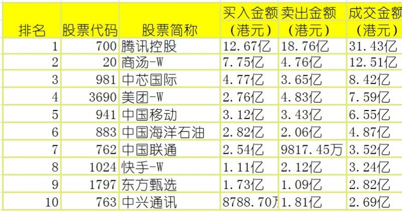 亚汇网实时数据统计:截至4月12收盘,腾讯控股、商汤-W、中芯国际(沪)成交前三,腾讯控股、商汤-W、中芯国际(深)成交前三。