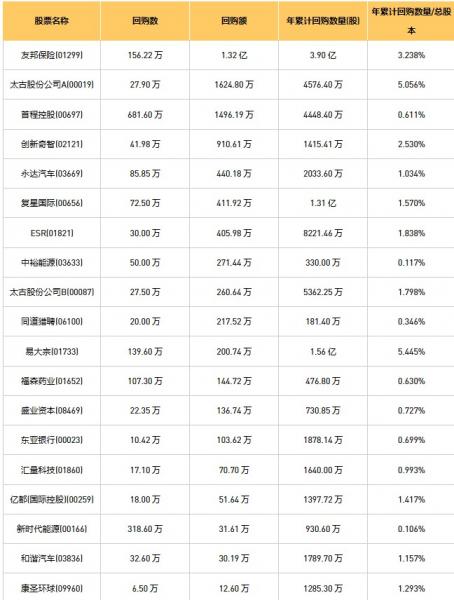 和谐汽车(03836)、摩比发展(00947)、天福(06868)、东亚银行(00023)、首程控股(00697)、太古股份公司A(00019)、太古股份公司B(00087)、友邦保险(01299)、盛业资本(08469)、复星国际(00656)、同道猎聘(06100)、创新奇智(02121)、亿都(国际控股)(00259)、中裕能源(03633)、新时代能源(00166)、汇量科技(01860)、永达汽车(03669)、易大宗(01733)、ESR(01821)、民银资本(01141)、康圣环球(09960)、福森药业(01652)、知乎-W(02390)于2023年4月13日进行了回购。其中,回购金额最大的为友邦保险(01299),回购数量156.22 万,回购金额1.32 亿元。