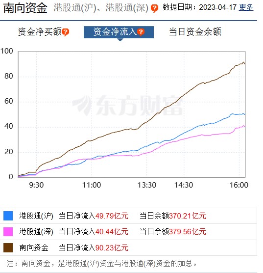 截至4月14日港股收盘,南向资金全日合计净流入逾90.23亿港元。其中,沪市港股通净流入49.79亿港元,深市港股通净流入40.44亿港元。