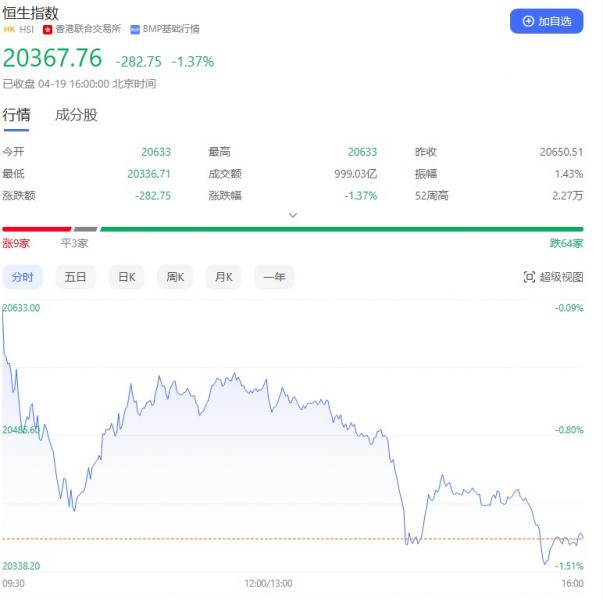 香港恒生指数开盘跌0.08%,全天呈震荡走弱态势。截至收盘,恒生指数跌1.37%或282.75点,报20367.76点,全日成交额999.03亿港元;恒生国企指数跌1.63%,报6889.01点;恒生科技指数跌2.39%,报4102.02点。