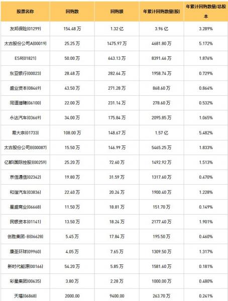 新时代能源(00166)、星盛商业(06668)、彩星集团(00635)、东亚银行(00023)、亿都(国际控股)(00259)、盛业资本(08469)、天福(06868)、和谐汽车(03836)、乐声电子(00213)、友邦保险(01299)、民银资本(01141)、京信通信(02342)、创胜集团-B(06628)、太古股份公司A(00019)、太古股份公司B(00087)、易大宗(01733)、永达汽车(03669)、康圣环球(09960)、ESR(01821)、同道猎聘(06100)于2023年4月19日进行了回购。其中,回购金额最大的为友邦保险(01299),回购数量154.48 万,回购金额1.32 亿元。