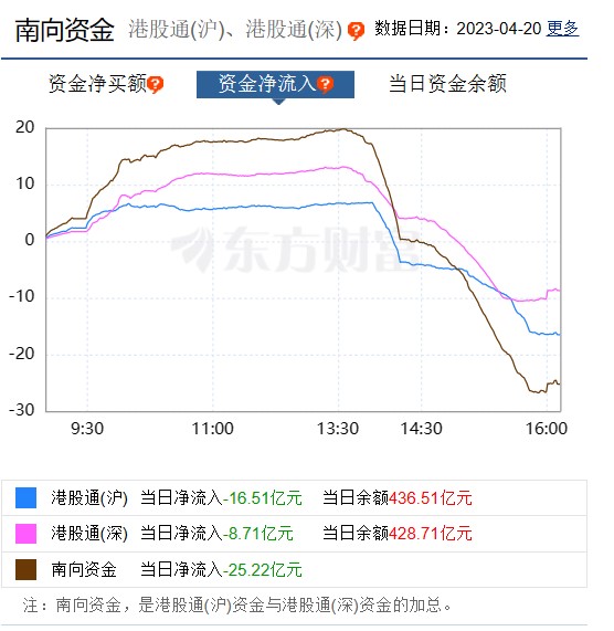截至4月20日港股收盘,南向资金全日合计净流入逾-25.22亿港元。其中,沪市港股通净流入-16.51亿港元,深市港股通净流入-8.71亿港元。