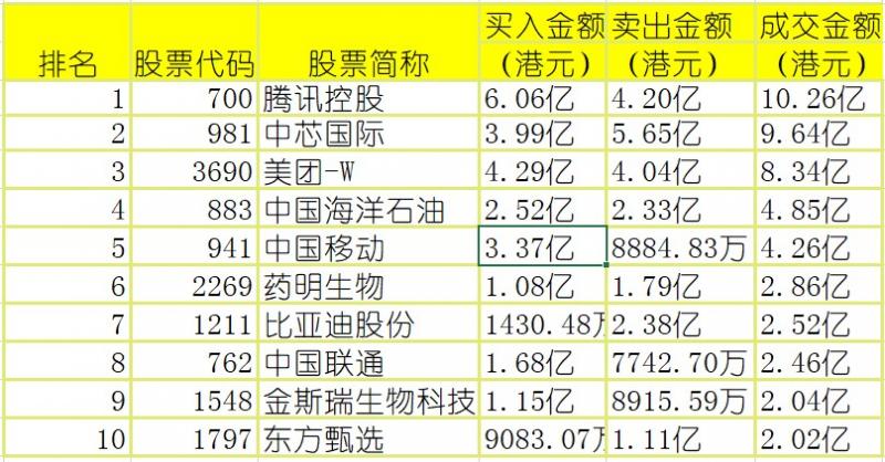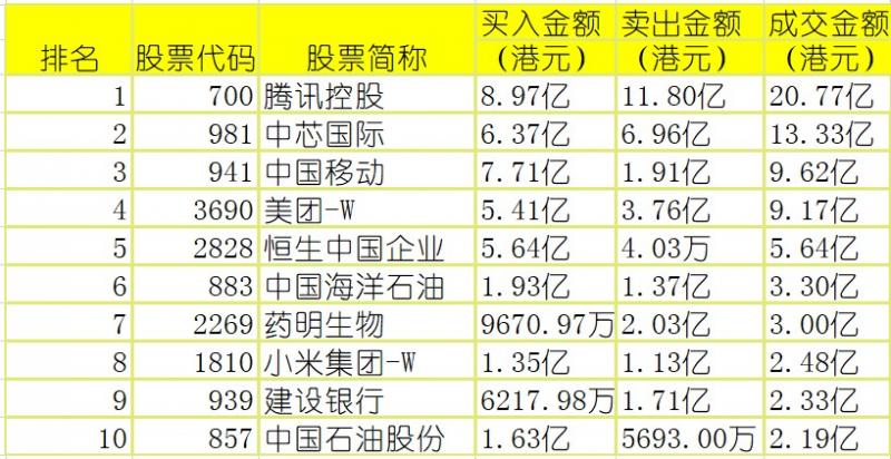 亚汇网实时数据统计:截至4月25收盘,腾讯控股、中芯国际、中国移动(沪)成交前三,腾讯控股、中芯国际、美团—W(深)成交前三。