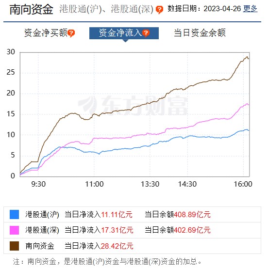 截至4月26日港股收盘,南向资金全日合计净流入逾28.42亿港元。其中,沪市港股通净流入11.11亿港元,深市港股通净流入17.31亿港元。