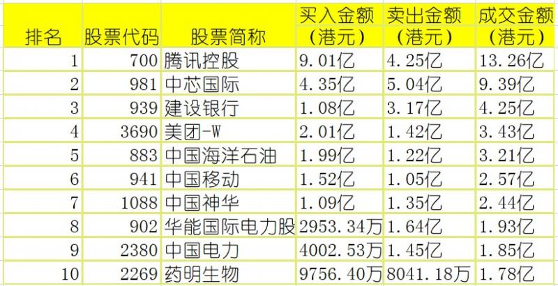 港股通(沪)买卖前十股(单位:港元):